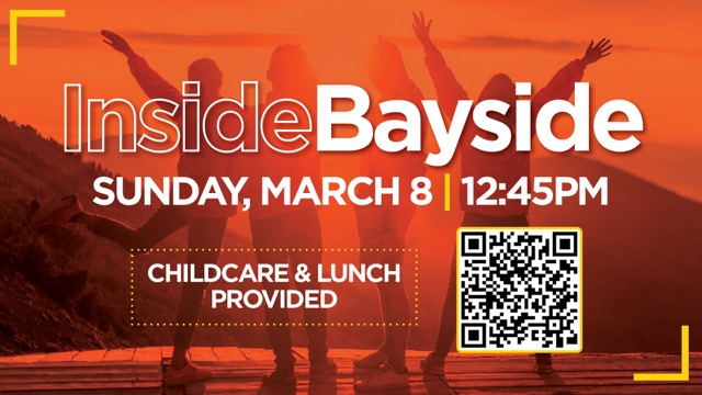 God's Story + Our Story + Your Unique Gifts all in one! If you haven't done "Inside Bayside" yet, this is for you! Join us and others on SUNDAY, March 8, 12:45-2:45pm right after our 11 am service...LUNCH and CHILDREN'S MINISTRY INCLUDED!